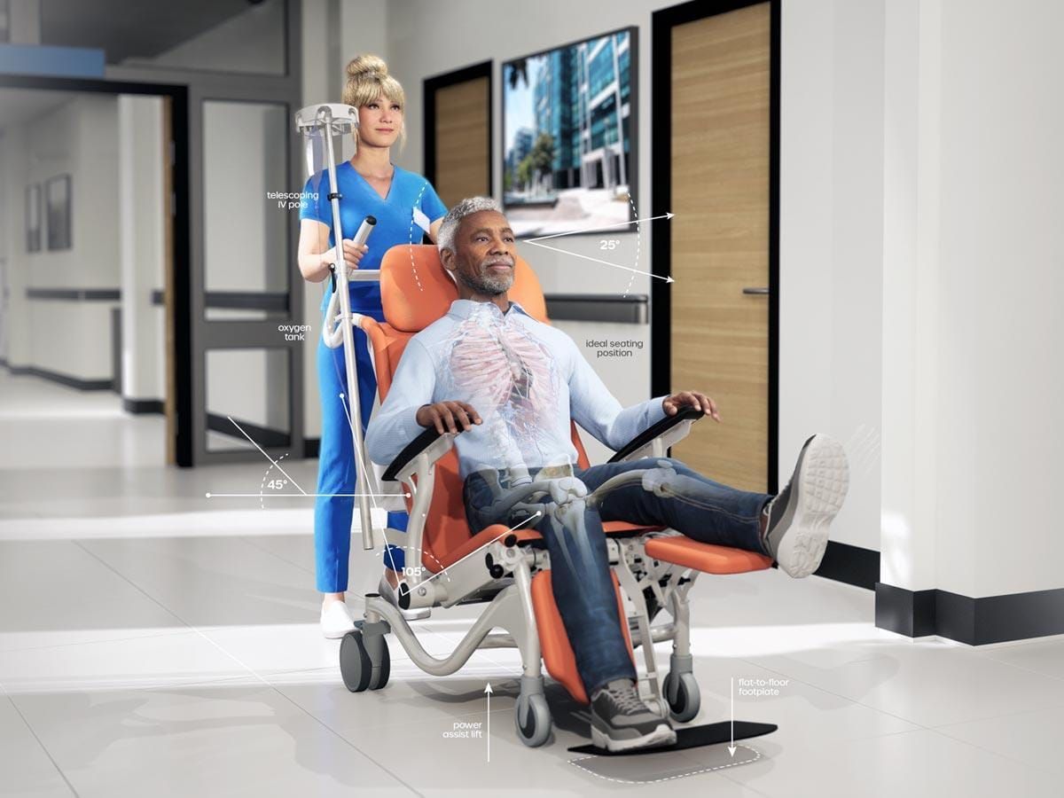 TPM Research designed the Care Continuum Chair to provide a clinically relevant solution for ideal seated patient transport, easy sit-to-stand dynamics, and early patient mobility.